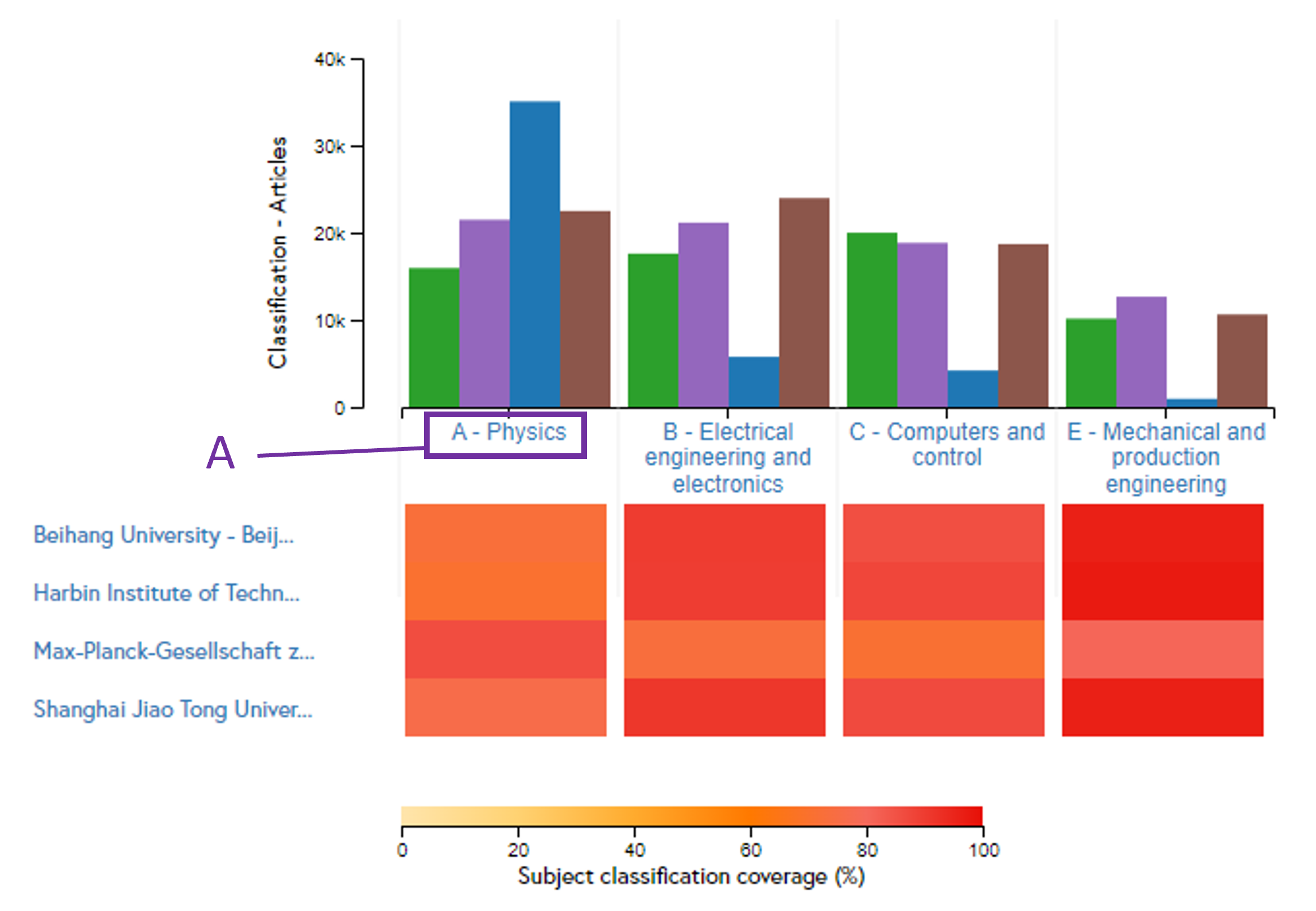 Heatmap (C): A heatmap below shows the subject classification coverage for each organisation. The warmer colours indicate a broader coverage within the subject.