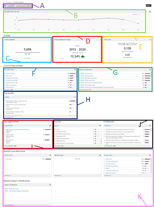 Co-Occurring Controlled Term tile (F): This tile shows the controlled terms that are frequently applied alongside your selected term. The number shows how many articles are indexed under both terms and the bar indicates this as a proportion. Click on a scientific term to jump to its Concept Page or click on the controlled heading to view and compare all co-occurring terms on the co-occurring controlled terms page.
