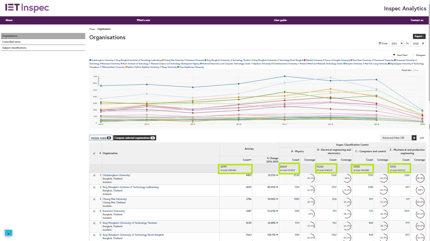 Using advanced search filters, users can explore the aggregate output for selected locations, organisation types or a bespoke list of organisations. This can be used to explore the number of article affiliations for a specific group of organisations, such as Russell Group Universities, corporate organisations, or organisations in a specific location. For example, you can see that there are over 42,000 article affiliations for organisations in Thailand.